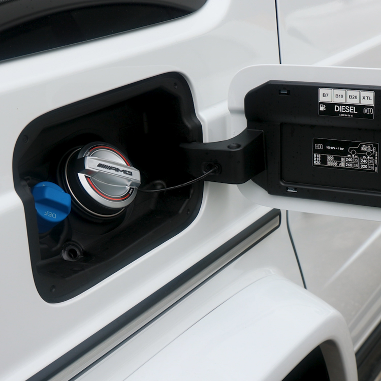 AMG 주유구 캡은 가솔린 기반 라벨링이 되어있어, 주유소에서 혼유(가솔린/디젤 혼동) 위험이 발생할 수 있음